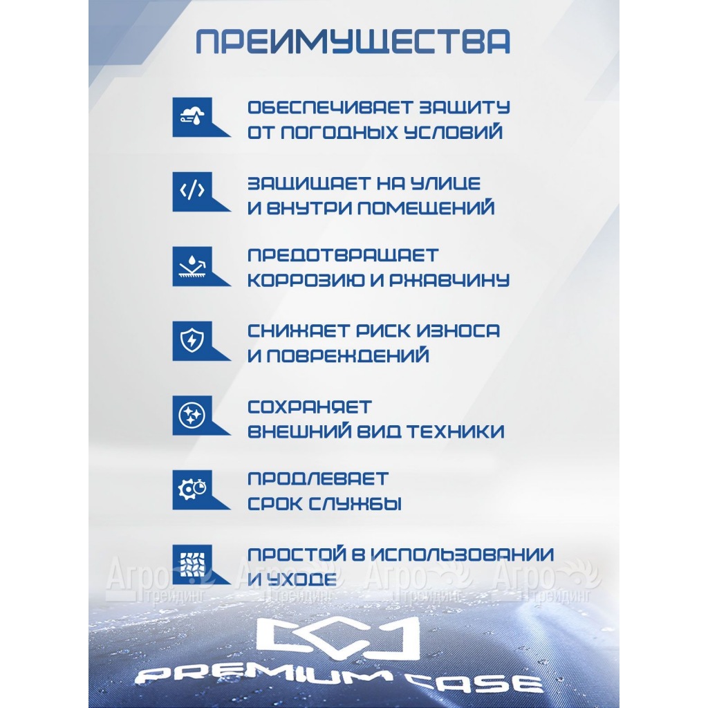 Два надежных фиксатора (спереди и сзади) и сверхпрочный шнурок внизу чехла обеспечивают его плотное прилегание к технике и гарантируют безупречную защиту от непогоды и каких-либо повреждений. Для удобства использования чехол-накидка оснащена практичными петельчатыми ручками, что дает возможность быстро как одевать, так снимать его с техники.